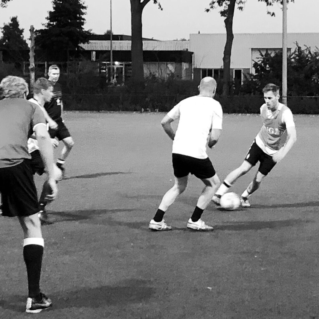 Ik had wel kunnen weten dat het natuurlijk zo niet gaat, dit was wel een tikkeltje naïef. Onder leiding van Arjan ‘begonnen we simpel en rustig, maar wel het tempo er in houden.’ Als je met vijf man moet afwerken en van naast de goal passes moet geven, moet je wel aardig doorlopen om dat tempo hoog te houden. Als er dan ook nog een element aan toegevoegd wordt: ‘Als ‘ie niet tussen de palen is, even een sprintje naar de achterlijn’, weet je dat het rustig afwerken niets wordt. Scheelt nog dat bij mij wel de meeste tussen de palen gingen.